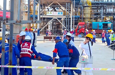演练模拟一名工人在5米高作业平台进行设备检修时,因安全带挂钩意外脱落坠落至下方安全网,造成左小腿骨折的紧急情况。事故发生后,现场安全员立即启动应急响应程序。应急指挥部在90秒内完成预案启动,警戒组迅速封锁现场并疏散周边作业人员,救援组携带专业设备抵达现场,医疗组同步完成急救物资准备。所有行动均在设备密集的净化装置区完成,各小组协同配合在最短时间内完成了救援任务。