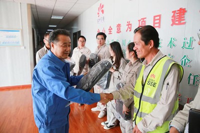 在项目现场,景建民为一线职工送上了背包、水杯等慰问品。发放完毕后,仔细询问了职工们的日常工作和生活状况,对大家在艰苦条件下坚守岗位、辛苦劳动的精神表示高度赞扬。他讲到,榆能化一期填平补齐工程能够顺利中交,是广大一线职工通过辛勤的劳动换来的,成绩来之不易,感谢职工们全心全意的付出。