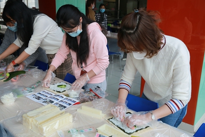 在这个属于“女神”的节日里,工会组织女职工进行了一场惬意又休闲的手工制作活动。工作人员将事先准备好的制作寿司、雪媚娘等食品所需要的原材料在职工食堂摆放整齐,让大家亲自动手进行制作。制作过程中,大家亲密交谈,协同制作,在忙碌的工作之余度过了一段难忘的午后时光。