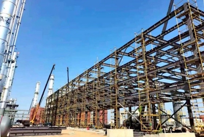 甲醇联合装置钢结构约7100吨。目前,甲醇装置管廊、精馏框架、变换框架、净化压缩机厂房钢结构已全面开始安装,累计完成安装2600余吨。(通讯员/衣成波 摄/衣成波)