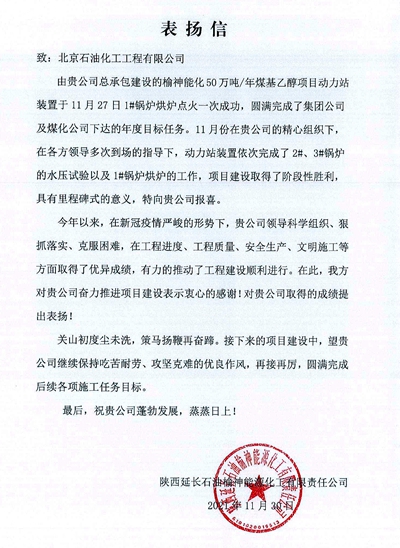 近日,延长石油榆神能化公司发来表扬信,对华球官网登录入口总承包的50万吨/年煤基乙醇项目动力站装置1号锅炉烘炉点火一次成功表示祝贺和感谢。据悉,1号锅炉于11月27日低温烘炉点火成功,该锅炉生产蒸汽能力达286吨/小时。目前,动力站3台锅炉试压工作已圆满完成,为项目中交奠定了坚实基础。
