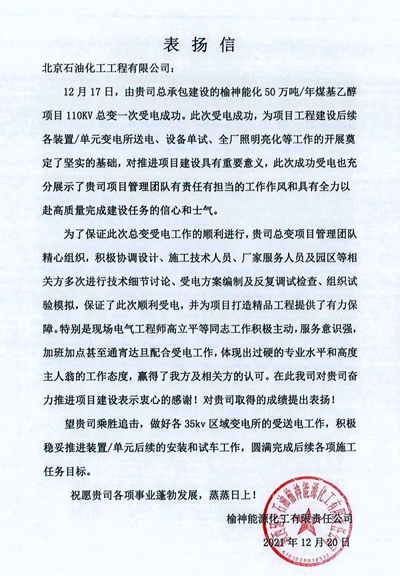 近日,延长石油榆神能化公司再次发来表扬信,对华球官网登录入口总承包的50万吨/年煤基乙醇项目110KV总变一次受电成功表示祝贺。此次受电成功,为项目工程建设后续各装置/单元变电所送电、设备单试、全厂照明亮化等工作的开展奠定了坚实的基础,对推进项目建设具有重要意义。