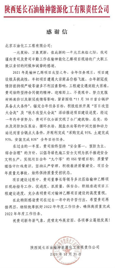 元旦前夕,华球官网登录入口先后收到延长石油集团和旗下的榆神能化公司发来的感谢信,信中对北油工程EPC总承包的50万吨/年煤基乙醇项目建设期间付出的辛勤劳动表示感谢,并向项目现场广大职工致以节日的问候。