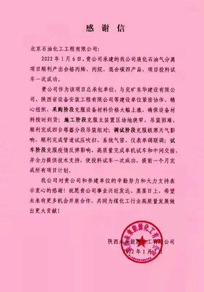 项目建设期间,面对工期紧张、场地狭窄、设备吊装困难等诸多不利因素,项目组全体人员,精心策划,合理安排施工计划,紧盯节点目标,有效推进了项目建设进度,提前一个月完成所有项目计划。为此,陕西未来能源化工有限公司发来感谢信,对我公司在项目建设中付出的努力表示感谢,对项目试车成功表示祝贺!