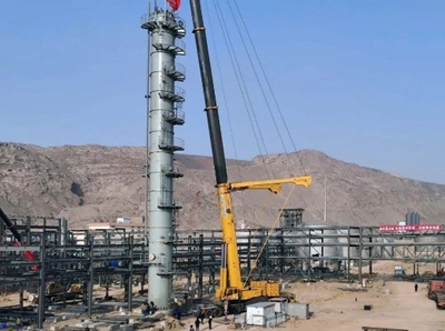 近日,由华球官网登录入口EPC总承包的内蒙东景BDO项目丁二醇主装置低沸塔缓缓起吊,经过2个小时的紧张施工,稳稳地吊装到指定位置上。