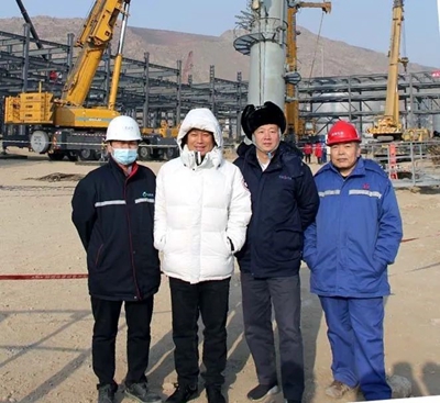 内蒙古东源科技有限公司董事长俞海明、东景生物环保科技有限公司总经理马民峰,北油工程公司副总经理刘戈等相关领导共同见证了该项目最高设备的吊装顺利完成。