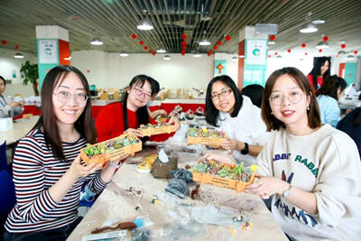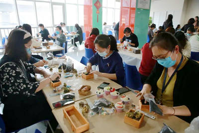 在下午开展的手工制作微景观植物活动中,让女职工显露出动手的天赋。工作人员事先准备了制作微景观多肉植物的相关材料,如玻璃瓶、木盒、繁殖土、铺面石、装饰砂石、摆件等,大家将不同种类的多肉植物搭配在一起,填土、配色、种植、铺面,不一会,一盆盆精美的盆栽争奇斗艳,大家分享经验,交流养护心得,释放了压力,舒缓了心情。