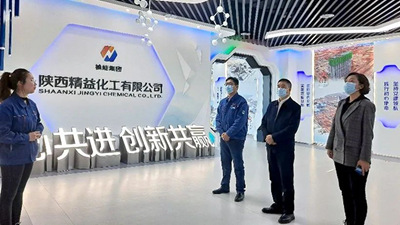 许缄涛一行首先来到陕西精益化工有限公司展览室进行参观,通过讲解员的讲解,就企业的发展历程、一期建设50万吨/年煤焦油深加工多联产综合利用项目及2×40.5MVA硅铁矿热炉综合利用项目等进行了了解。