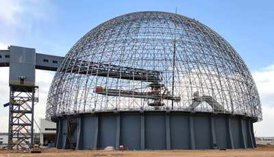 圆形煤场为全封闭半球形结构,建筑面积约5800平米,可堆放燃煤4万吨燃煤,满足全厂储煤要求,是全厂最大的钢网结构建筑。