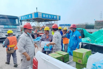 浇筑期间,正值高温天气,项目组采购了饮料、矿泉水等防暑降温慰问饮品,为坚守一线的工人送去丝丝凉意,感谢他们的坚守与付出。