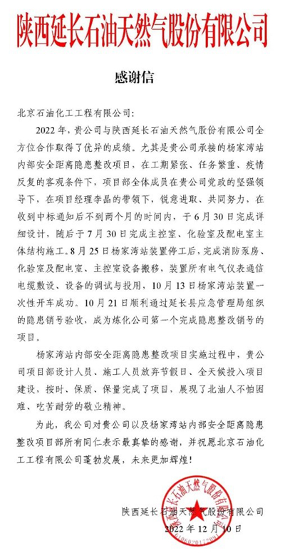 近日,华球官网登录入口收到来自陕西延长石油天然气股份有限公司的感谢信,对我公司总承包的杨家湾站内部安全距离隐患整改项目在建设期间精心策划、合理安排施工、克服不利因素,保质保量按期完成了任务目标,得到了业主的肯定。