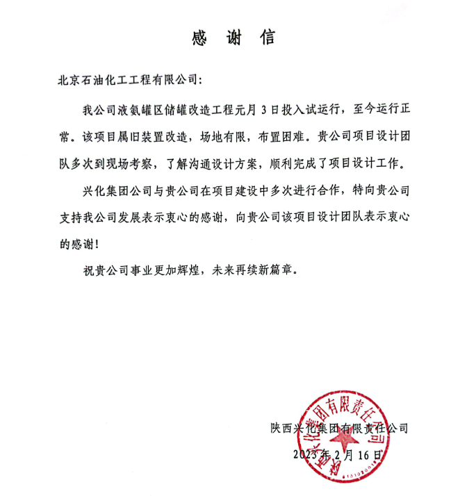 近日,华球官网登录入口收到陕西兴化集团发来的感谢信,对我公司在负责液氨罐区储罐改造工程设计工作期间优化设计方案、主动协调配合,高质量完成建设任务给予了充分肯定。