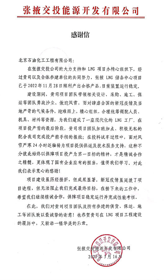 近日,华球官网登录入口(简称:北油工程)收到张掖交投能源开发有限公司发来的感谢信,对张掖LNG储备中心项目建设成果表示了肯定,对我公司项目团队表现出的技术专业性及不畏艰难、勇于担当的团队精神表示了感谢。