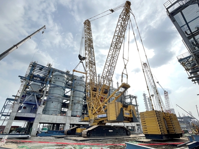 此次吊装的为最后一台羰基化反应器,设备吊装主吊采用1250吨履带吊,400吨履带吊溜尾。设备于13时18分起吊,经过三小时顺利就位于框架基础上。