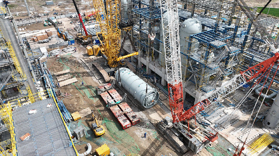 随着最后一台羰基化反应器的吊装就位,羰基化单元具备设备及钢构收尾条件,为雨季高温前的管道安装攻坚创造有利条件。(通讯员/黄耀辉 摄/王超)