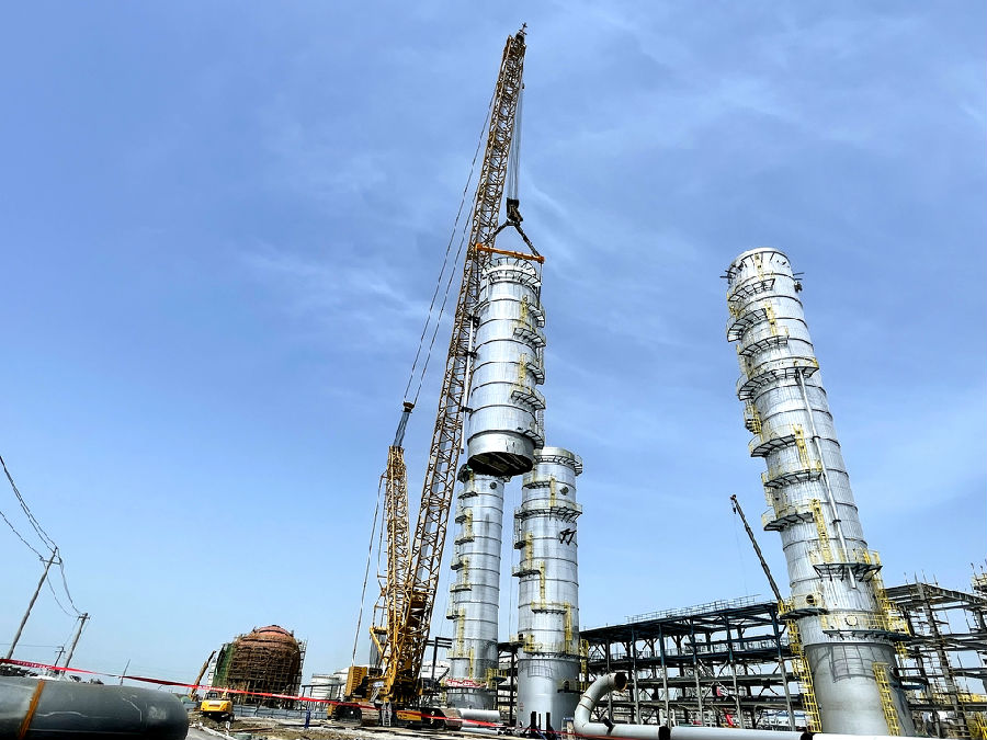 乙醇精制塔上塔上段直径7.8米,吊装总高74.4米、总重约220吨,吊装主吊采用1250吨履带吊,400吨履带吊溜尾。设备于4月16日11时18分起吊,经过2小时完成组对合口,顺利启动焊接工作,预计焊接工作将持续4至5天。