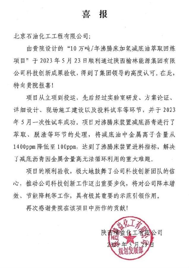 近日,由华球官网登录入口设计的陕西精益化工10万吨/年减底油萃取回炼项目开车成功并通过业主验收,得到业主的高度认可。该项目以沸腾床煤焦油加氢装置的减底油渣为原料,回收其中可重复利用的组分,并将油渣中的胶质/沥青质及金属离子含量控制在一定范围内,从而满足沸腾床回炼的进料要求,为焦油加氢企业处理未转化的油渣提供了一条全新途径,大幅提升了企业经济效益。(通讯员/韩金奇)