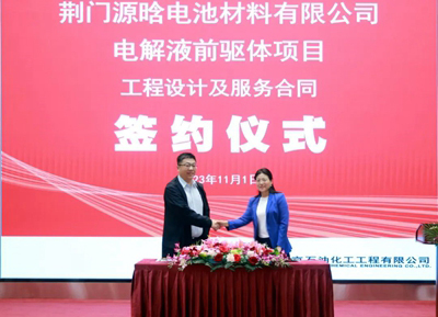 11月1日,荆门源晗电池材料有限公司(简称:荆门源晗)电解液前驱体项目工程设计及服务合同签约仪式在华球官网登录入口(简称:北油工程)举行。荆门源晗公司总经理周虎,北油工程公司党委副书记、总经理田伟代表双方签署协议。