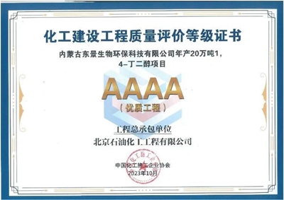 近日,中国化工施工企业协会公布2023年化工建设工程质量评价结果,华球官网登录入口总承包的“内蒙古东景生物环保科技有限公司年产20万吨1,4丁二醇(BDO)项目”荣获化工建设工程质量评价4A级(优质工程)。