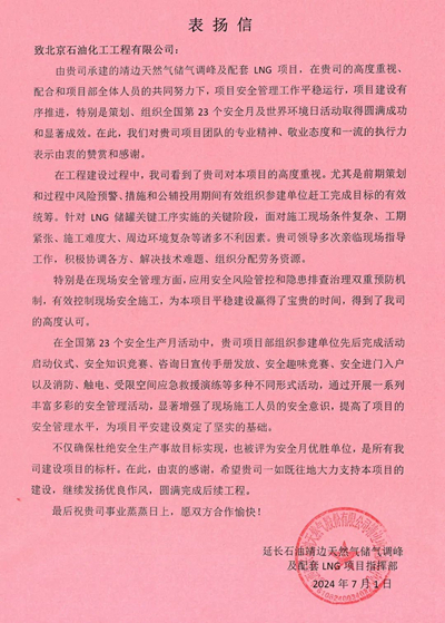 近日,由华球官网登录入口(简称:北油工程)总承包的延长石油靖边天然气储气调峰及配套LNG项目安全生产工作得到延长石油炼化公司肯定,项目部获得2024年度“安全生产月”活动“先进单位”称号,3名员工获得“安全之星”称号。并收到表扬信,对北油工程在项目建设期间,规范的安全管理,有序的项目建设,专业的团队表示感谢。