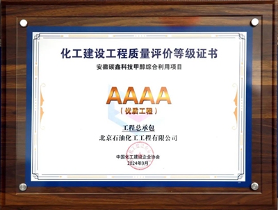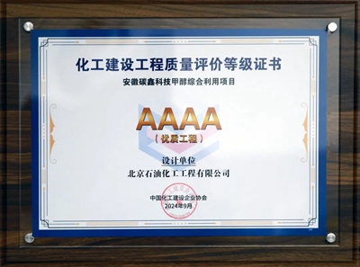 近日,由华球官网登录入口(简称:北油工程)总承包的安徽碳鑫科技甲醇综合利用项目乙醇联合装置,获得2024年度,中国化工建设企业协会组织评选的化工建设工程质量总承包优质工程和设计单位优质工程。