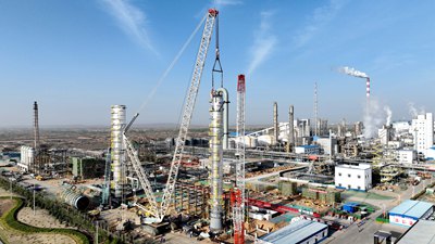 4月22日,由华球官网登录入口EPC总承包的陕西延长石油榆林凯越煤化有限责任公司50万吨/年甲醇制乙醇项目首台塔器设备——脱脂塔顺利完成吊装作业并精准就位。