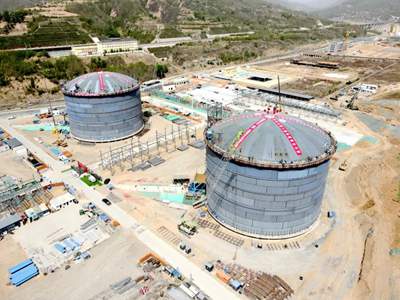 据悉,作为LNG储罐建设过程中最具挑战性的环节,“气压升顶”工艺难度高、风险高。本次实施气顶升的1号、2号储罐采用先进的双金属全容结构,外罐内直径达52米,拱顶跨度51.8米。在历时2小时18分钟的精密操作中,成功将单体重达457.37吨的储罐穹顶平稳提升29.57米,最终实现与承压环的精准对接,为后续3号、4号储罐穹顶升打下坚实基础。