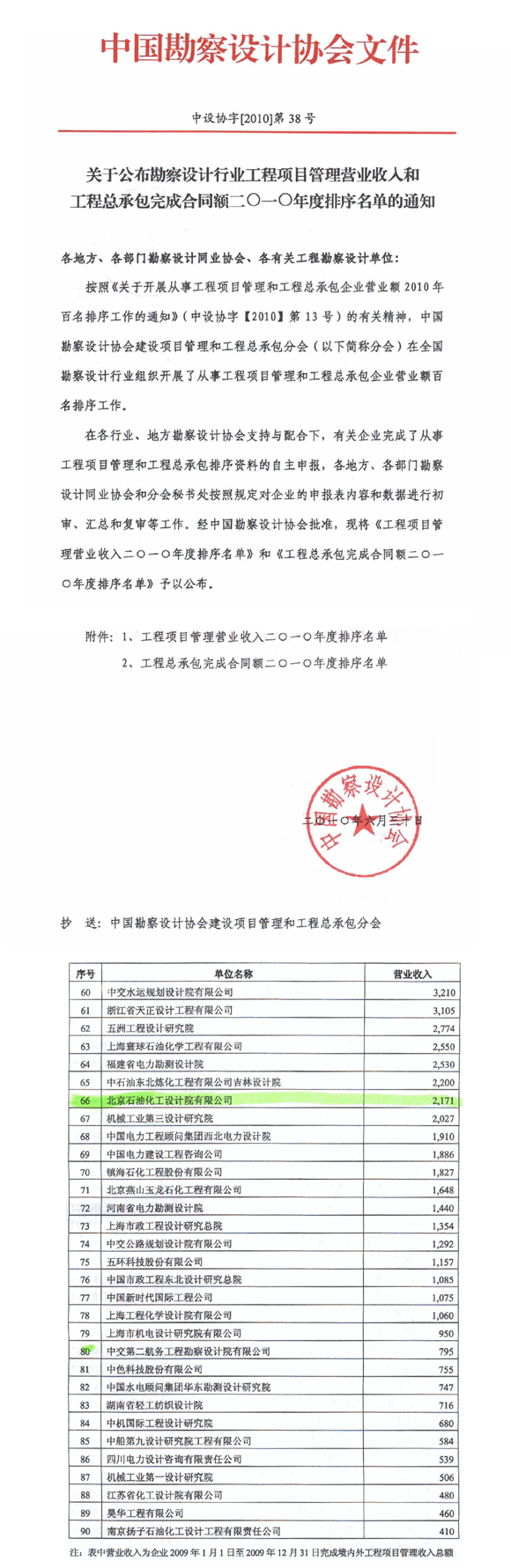 在中国勘察设计协会(中设协字[2010]第38号)近日公布的“勘察设计行业工程项目管理营业额收入二〇一〇年度排序名单”中,我院喜获排名第66位,这是继二〇〇八、二〇〇九年之后,我院连续第三次跻身全国百名排序名单之中。